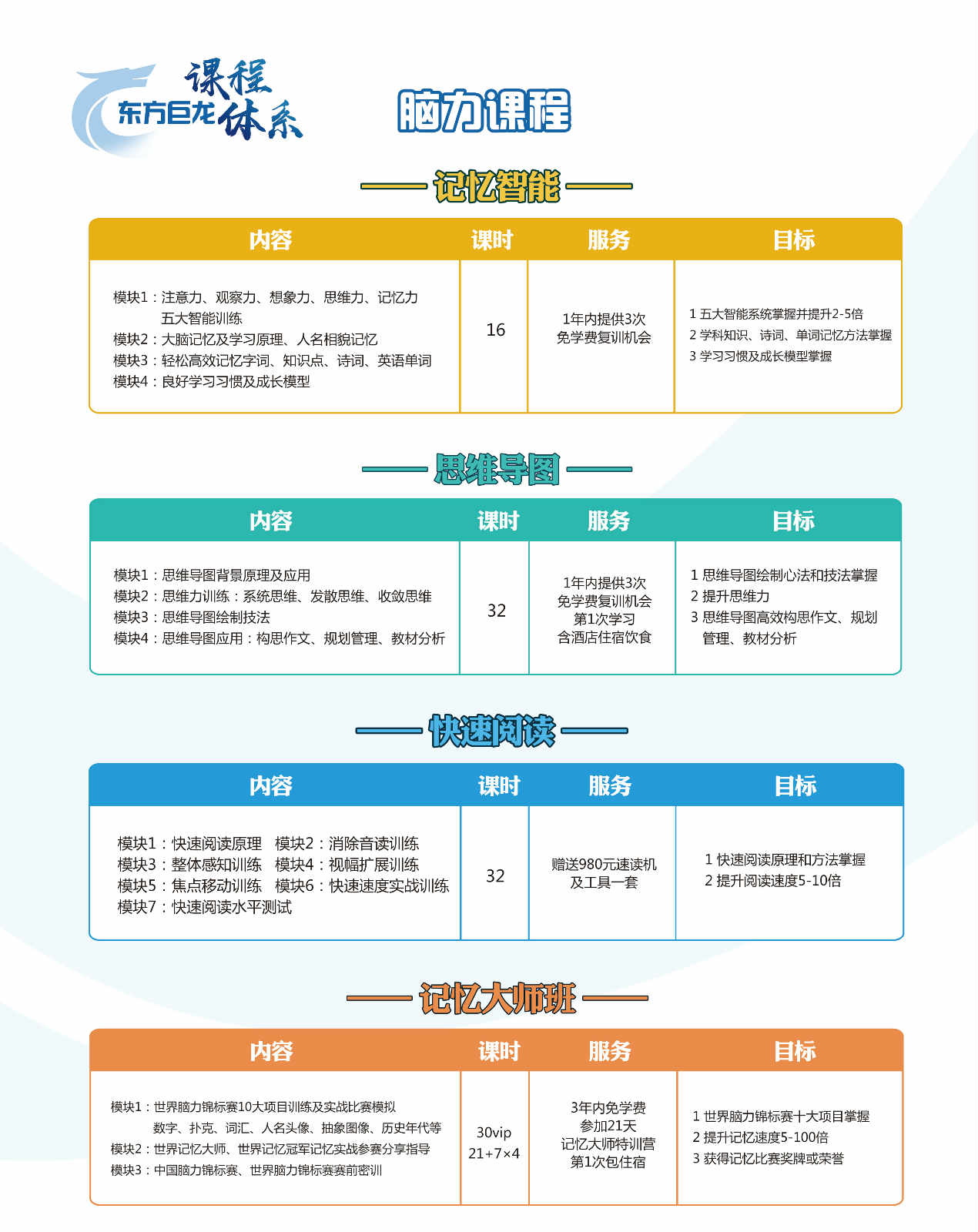 武汉东方巨龙教育科技有限公司的宗旨是整合优质的东方巨龙教育资源,以开发和提高莘莘学子的智慧为根本,形成一种新型的少儿英语教育培训的教学模式,进而创建中国专业的以培优让您放心省心为主的教育培训机构。 延伸拓展 产品详情:全脑开发训练的核心为什么是右脑  很多人会问全脑开发不是注重全脑发展吗为什么会有个核心出来,又为什么是右脑,这不就说明重点在右脑了吗,那么为什么是全脑开发训练的核心是右脑呢,下面我们一起来看看吧!  全脑开发教育又称“全脑教育”或“右脑开发”(因为右脑能力占大脑能力的90-95%以上),是指对人脑的左右脑同时进行开发和训练;是通过全面启动右脑建立左右脑的第二次协同训练中_国_便_民_网。  美国加州大学医学博士斯佩里的“左右脑分工”理论、美国艾登•泰勒博士的“潜意识输入法”和美国哈佛大学霍华德•加德纳的“多元智力理论”是我们全脑开发与学习的理论基础和实践指南。  “全脑教育”颠覆了几千年传统教育的许多教育理念中_国_便_民_网。录音像思维功能表现出的“过目不忘、过耳成诵、长久记忆”的记忆力颠覆了传统教育中的重复记忆,波动思维功能表现出“瞬间悟解、波动计算”颠覆了传统教育中的逻辑思维和逻辑计算。 全脑开发=左脑+右脑(左右脑各个部分的全面开发)  “全脑教育”,是以人脑为核心的整个身心功能的全面开发,在教学中采用相应的专注力训练,记忆力训练,空间感知能力训练,思维训练,读图能力训练,想象力训练,创造力训练等内容和形式,重点激活孩子右脑的想象能力,图像能力及右脑五感的能力,配合左脑的五感,全面提升孩子的综合能力中~国~便~民~网。达到扩大脑容量,提升脑速度,让孩子身心更加健康快乐成长!